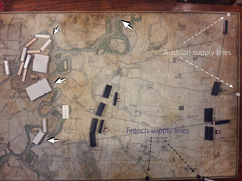 Secondly is the time crunch. Austria gets a surprise turn 0 that allows them to get a jump on the French. They need this. If you measure in 2/3 inf move increments from the crossing east of Alexandrie to the eastern map edge, it will take them almost all game to reach their supply lines. The French don’t need to defeat them so much as delay them without being defeated themselves.