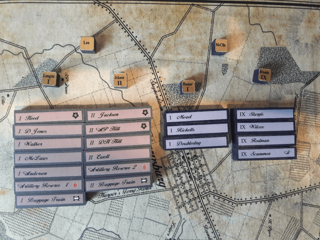 At the corps level, Hooker’s I corps at Antietam has 3 blocks. Each block requires 3 hits to be eliminated. I Corps can be thought of as having nine “hits” of strength. It would seem a simple task to assign it nine hit points on a card, done. Except, in Pub Battles those nine hits travel in 3 discrete groups of three. Furthermore, if in range of an unpacked Baggage Train they can recover a hit. One of the hits is actually used to retreat, so it is “recovered” as soon as taken. At any point prior to elimination, if the discrete group attacks, it attacks at full strength. Some Corps can have Elite or Militia troops, further complicating and reflecting differences at the Corps level.