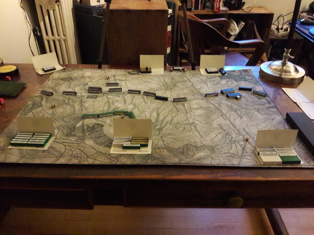 If you are playing solo, it is called “Schrödinger’s Napoleon.” Like Schrödinger’s cat, Napoleon is both there, and not there, until you examine the HQ. When the HQ comes within the Allied LOS, roll a die. On a 4+ Napoleon is there with the rest of his army. Otherwise, only the first three Corps are on the map. If you find it difficult to play as though you didn’t know, then this option solves that.