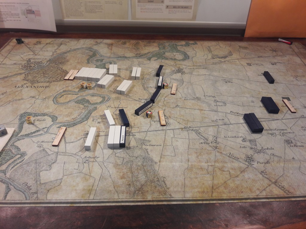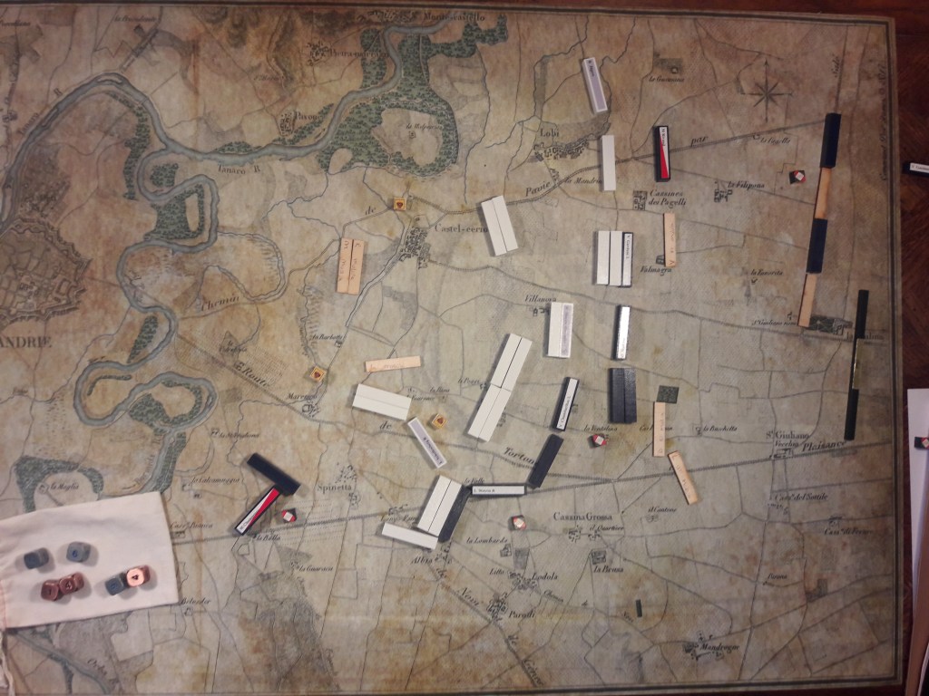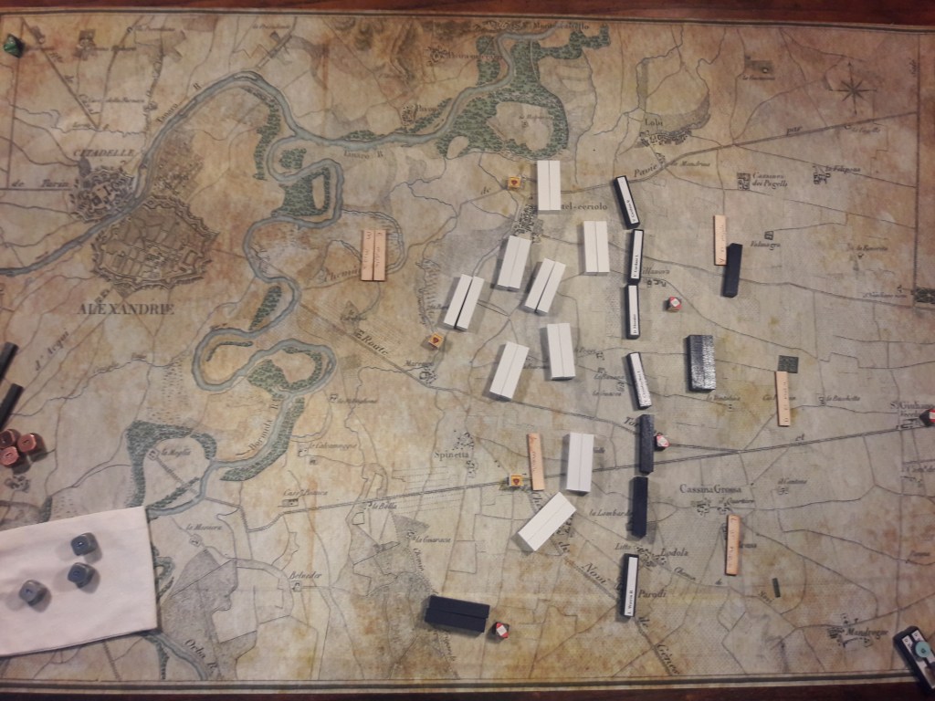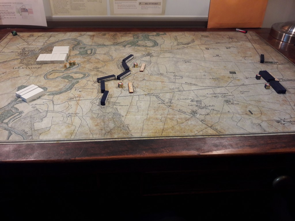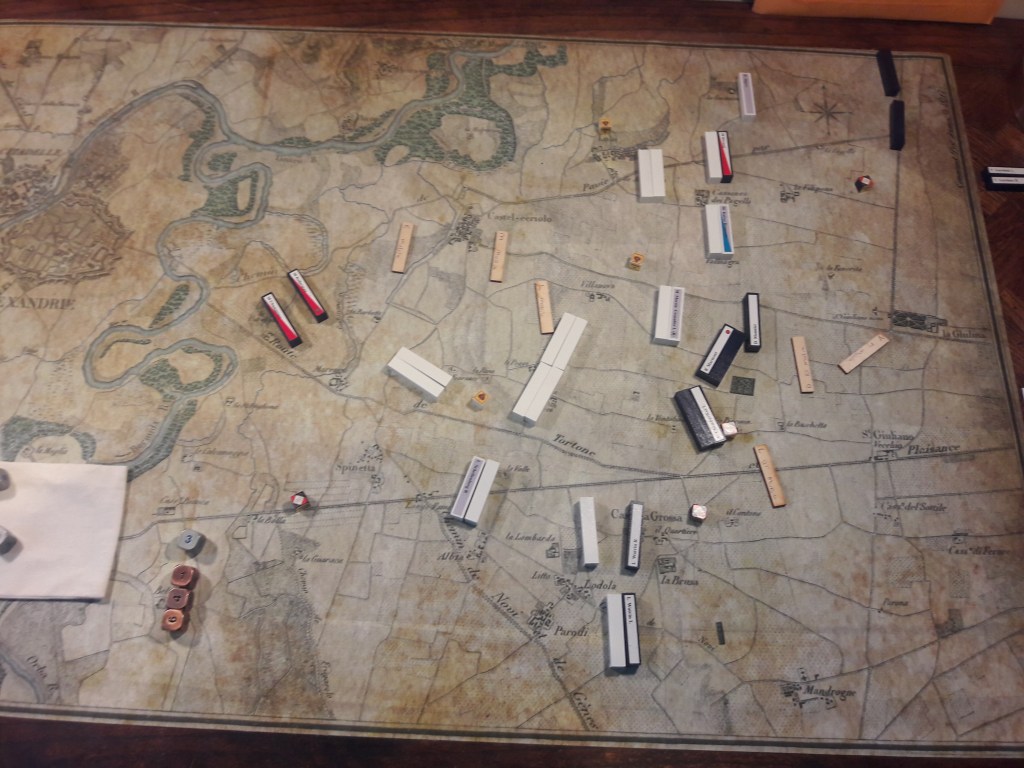 Secondly is the time crunch. Austria gets a surprise turn 0 that allows them to get a jump on the French. They need this. If you measure in 2/3 inf move increments from the crossing east of Alexandrie to the eastern map edge, it will take them almost all game to reach their supply lines. The French don’t need to defeat them so much as delay them without being defeated themselves.