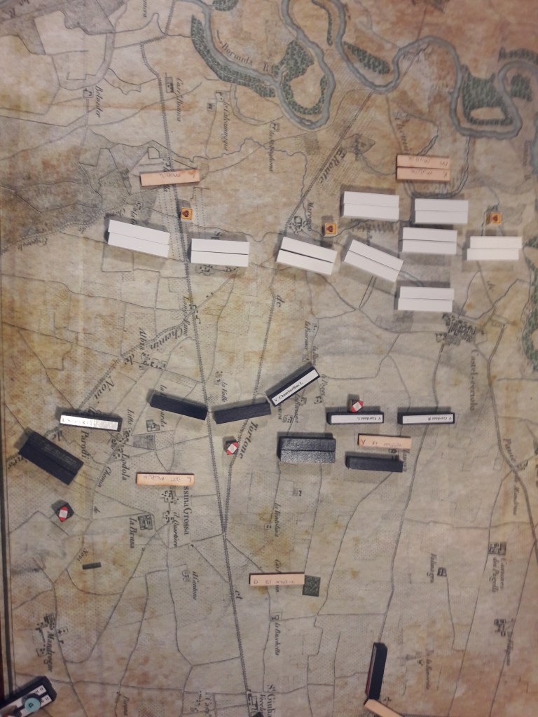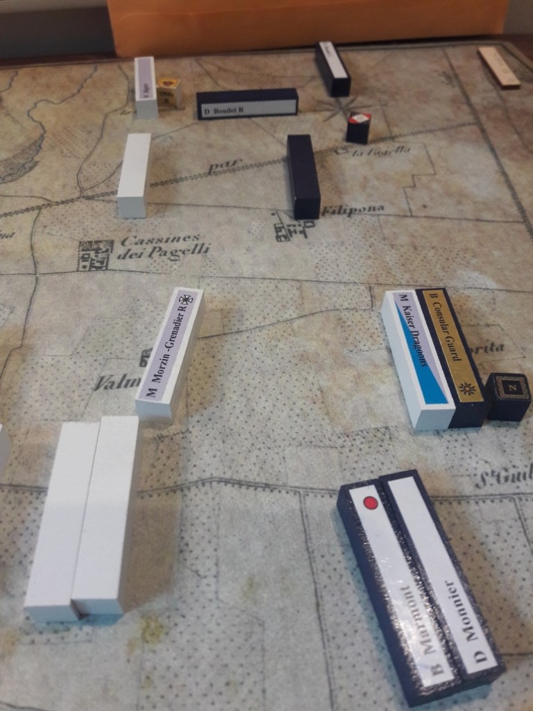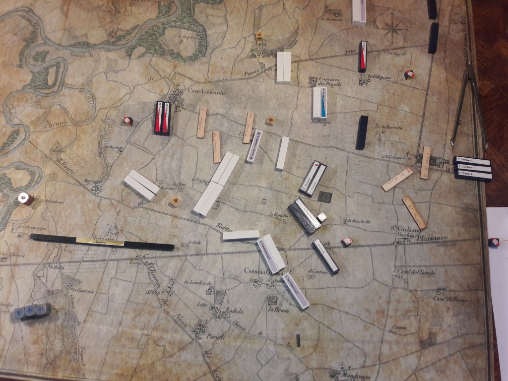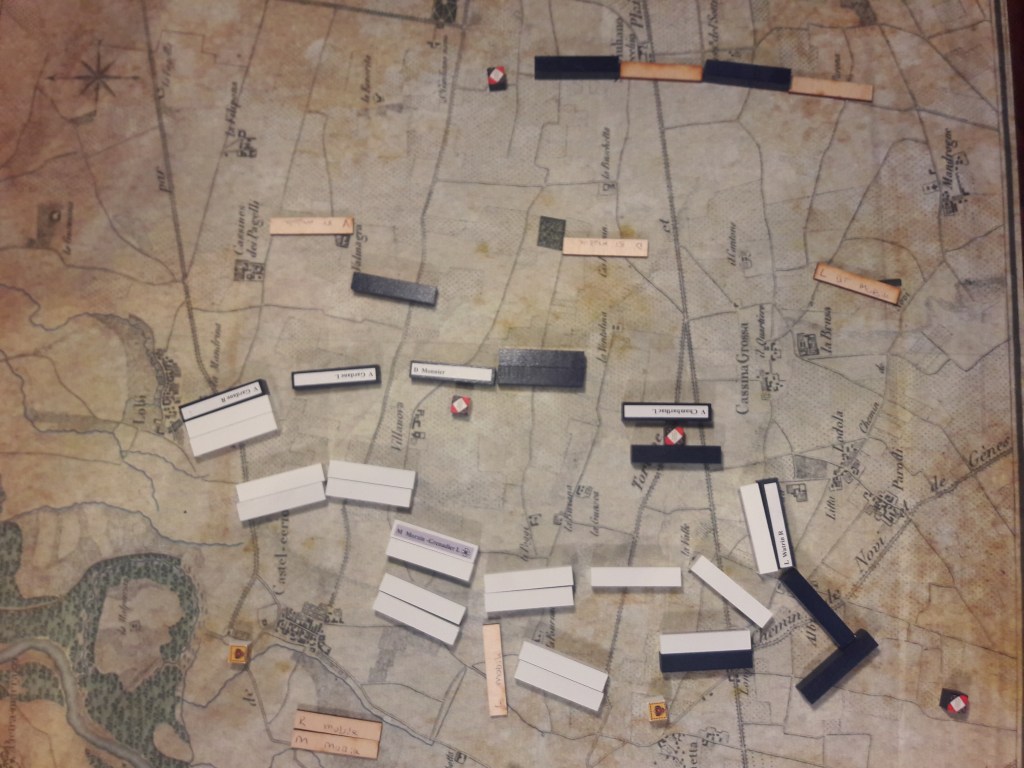 The 3.0 rules clarify that the Northern road crosses the river at Monte-Castello, and that optional Northern route is pretty good for one of Melas’ other commands, as it draws off units the French can ill afford to spare. It is not a sure-win strategy, or the game would be broken, but it is an option. I chose to go with a more historical start, “Hey diddle diddle, straight up the middle!” After all, the Austrians have the strength of numbers, why not concentrate?