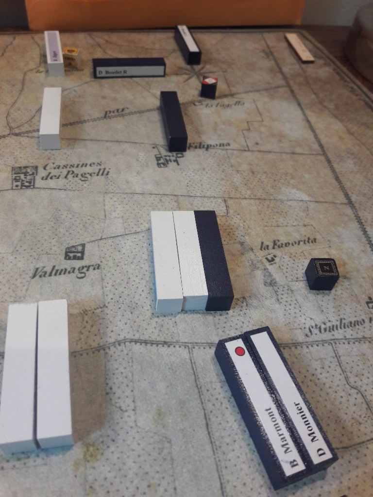 The French try to buy time because on turn 3 Murat gets another cavalry division and Turn 5 Desaix appears. I do not have the 3.0 upgrade kit yet, so I have made some temporary Baggage Trains with my column markers. On one side they say “Mobile” and on the other “Set” to show them unpacked.