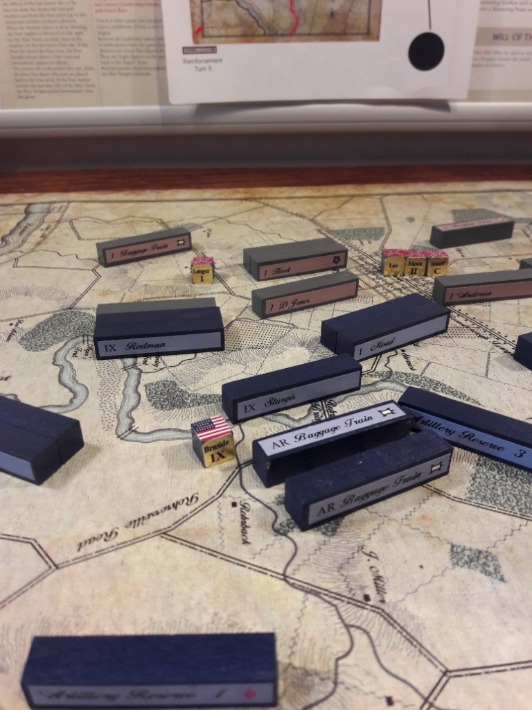 Meta-game notes: The Union and the Confederacy have both elected to unpack one Baggage Train each. This allows both Hood’s Texans and Hooker’s men to refit and recover.