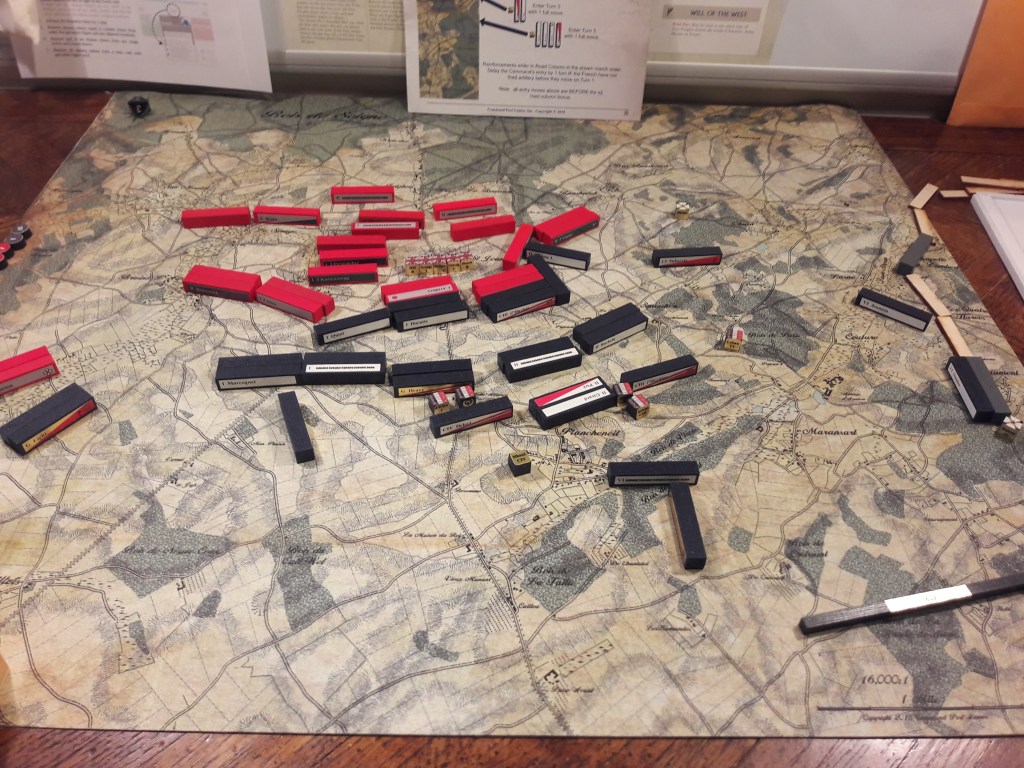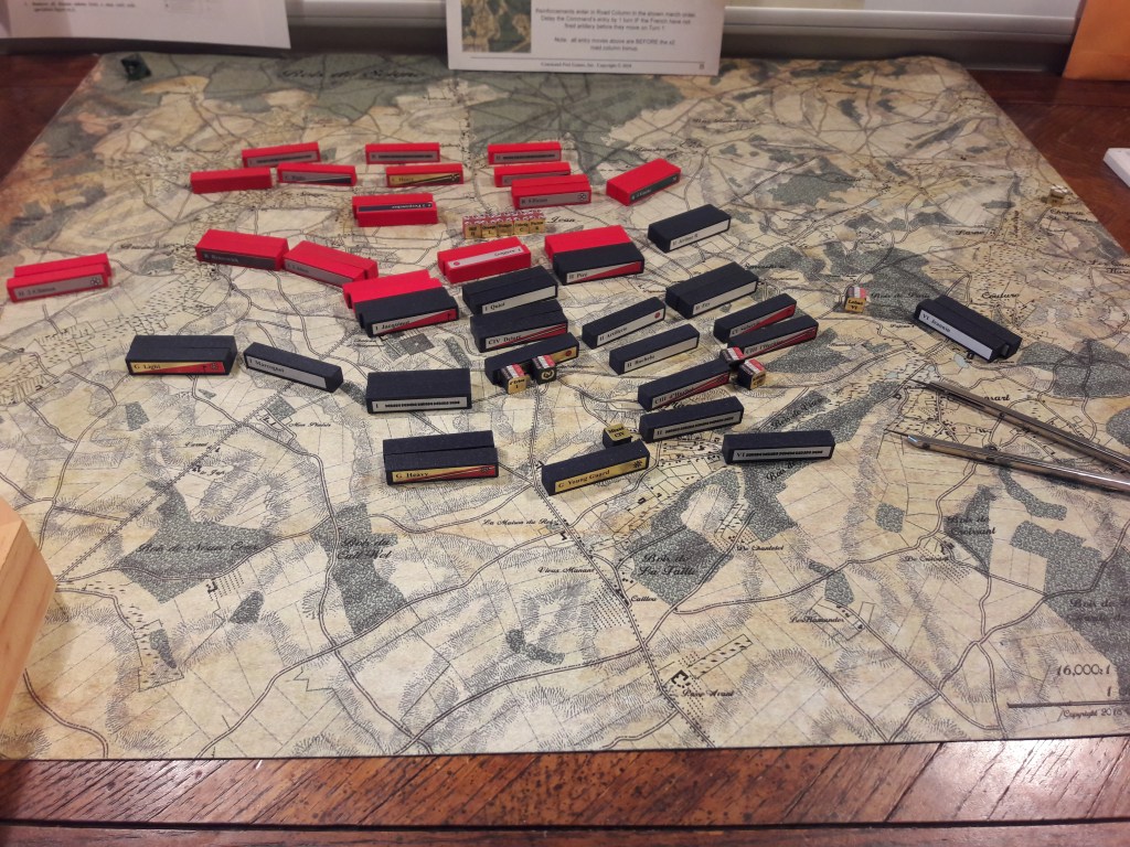 In the mean time, I thought I’d try the Grouchy variant that allows Grouchy’s Corps to start arriving as if the original message had called him hence. This is turn one after movement, but before combat. Bulow’s IV Prussian Corps HQ can be seen on the extreme right. If this were any other army and a major road, the whole corps would arrive in almost one turn. Instead, it is a minor road and the Prussians must have two blocks trailing each unit to show their huge baggage trains. It will take most of the game to get them on the battlefield!